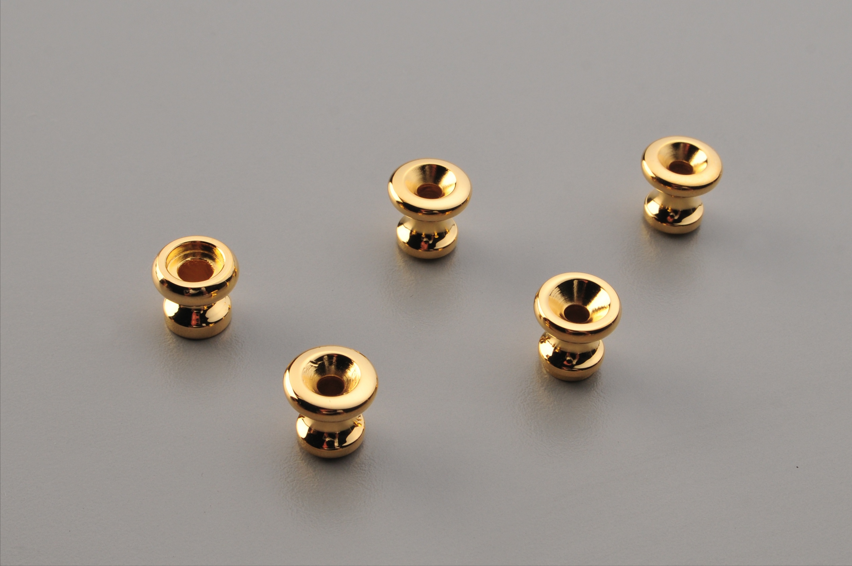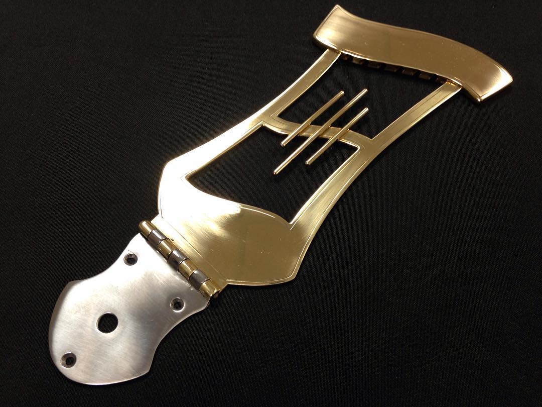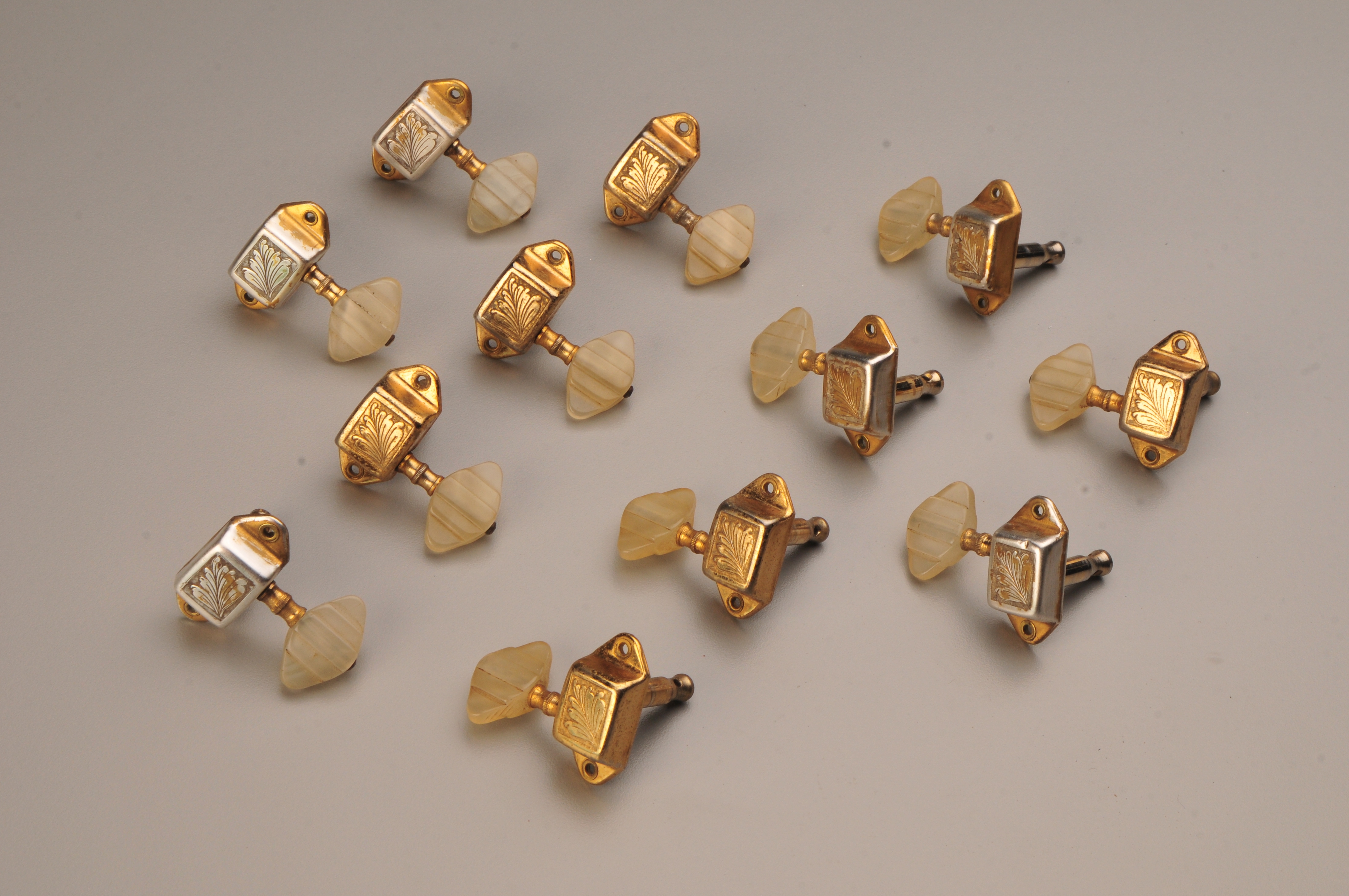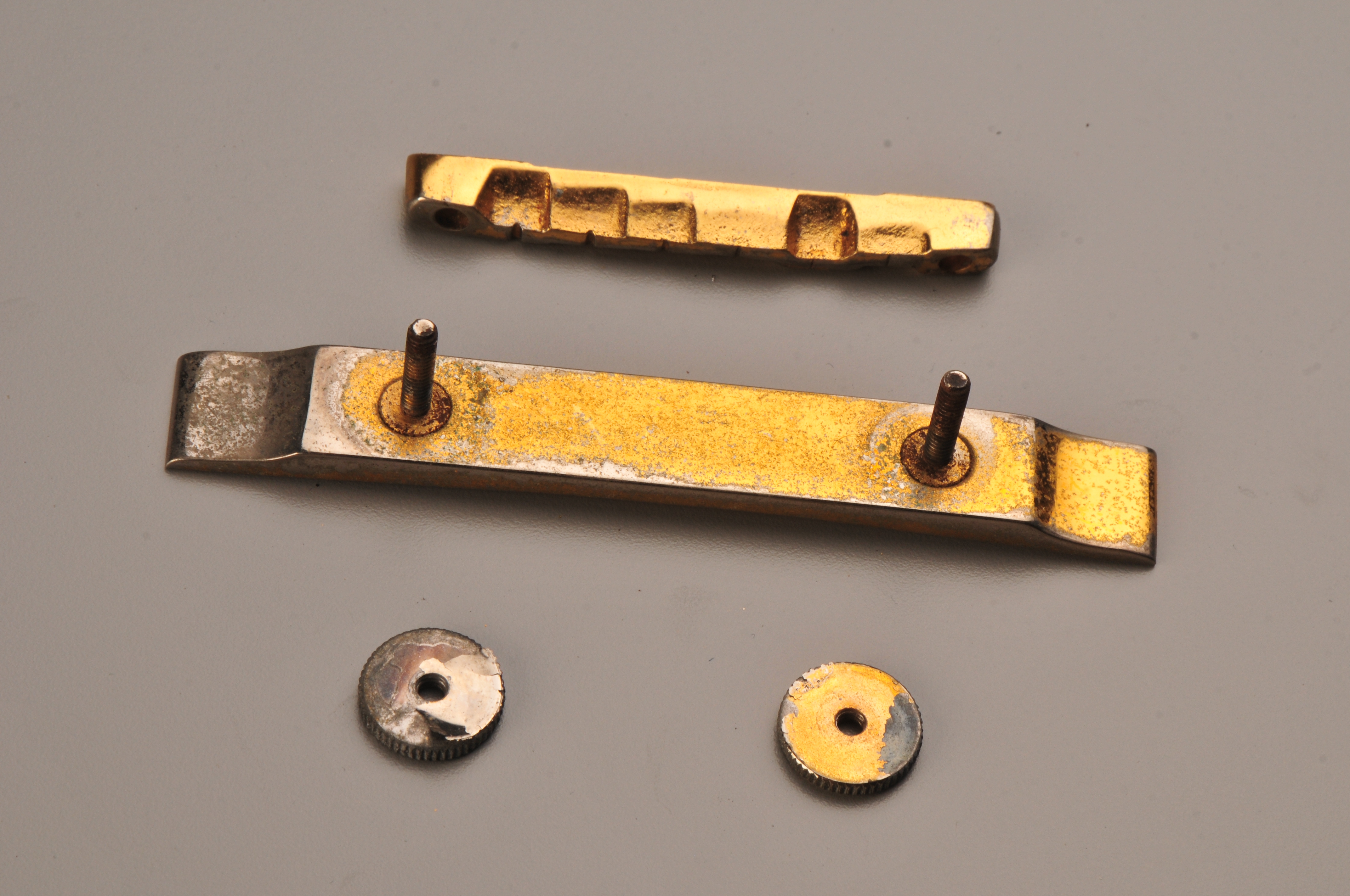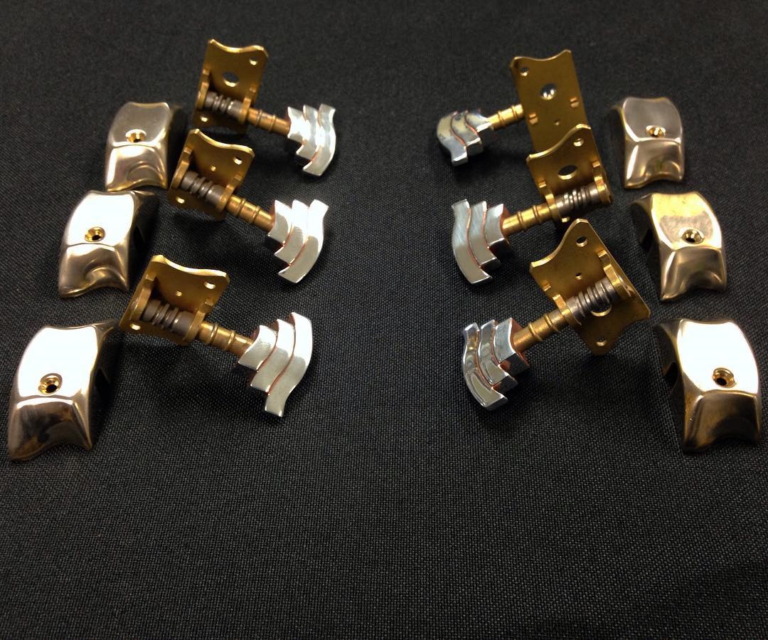 We recently finished up a restoration of vintage Guild parts, tailpieces, tuning machines, and various components. All components were restored to 24K Gold, where the tuning machines received special treatment. For added detail we carefully wore through the gold plating on the floral portion of the tuning machine cover and revealed the nickel plated underneath.
