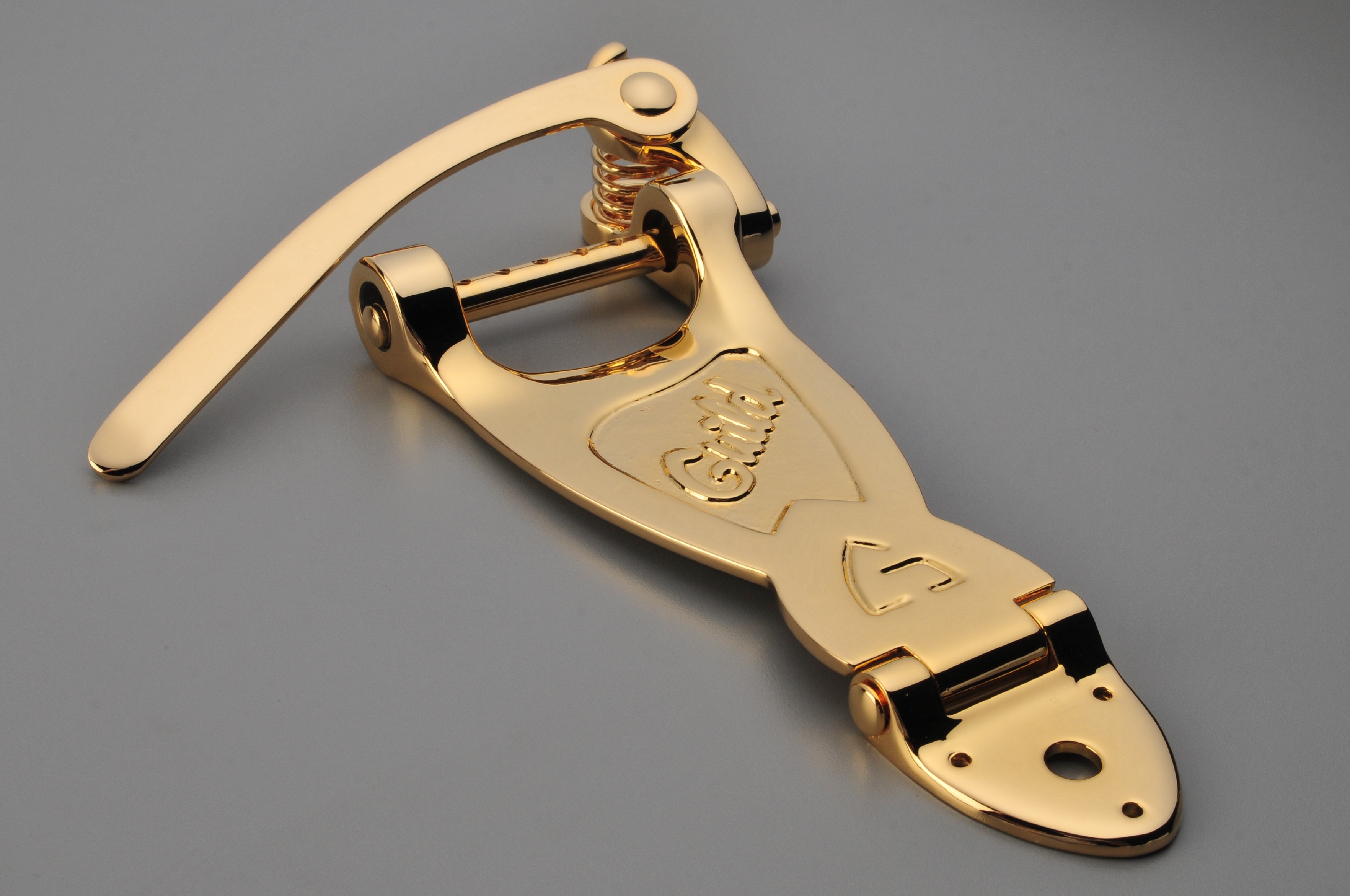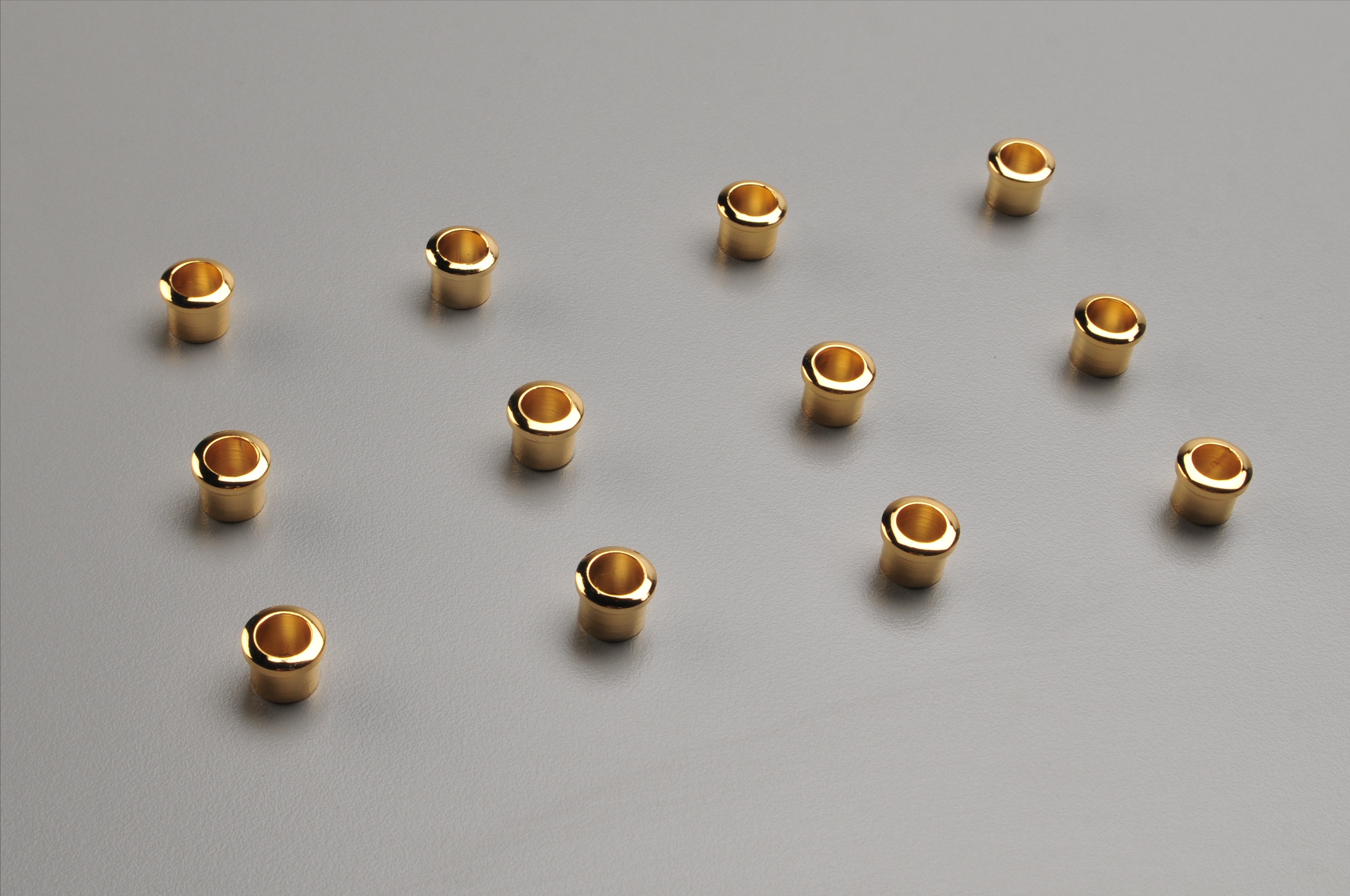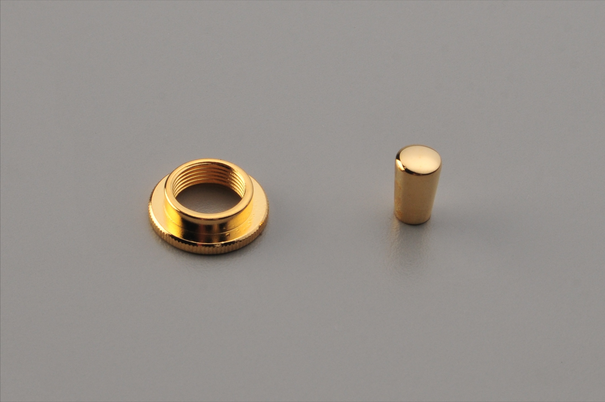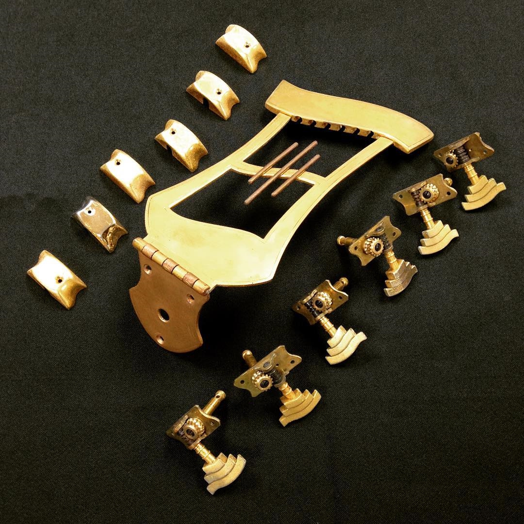 We recently finished up a restoration of vintage Guild parts, tailpieces, tuning machines, and various components. All components were restored to 24K Gold, where the tuning machines received special treatment. For added detail we carefully wore through the gold plating on the floral portion of the tuning machine cover and revealed the nickel plated underneath.