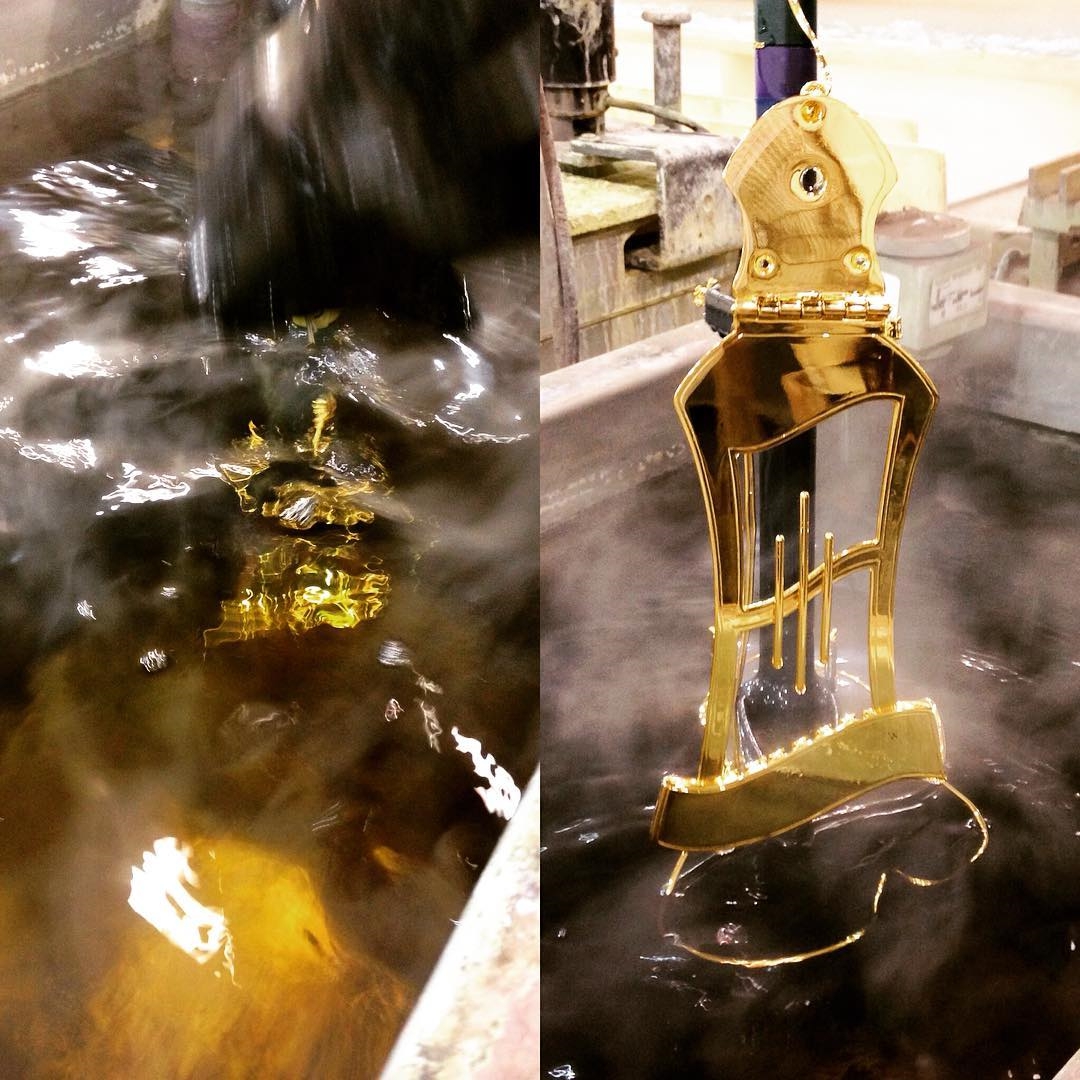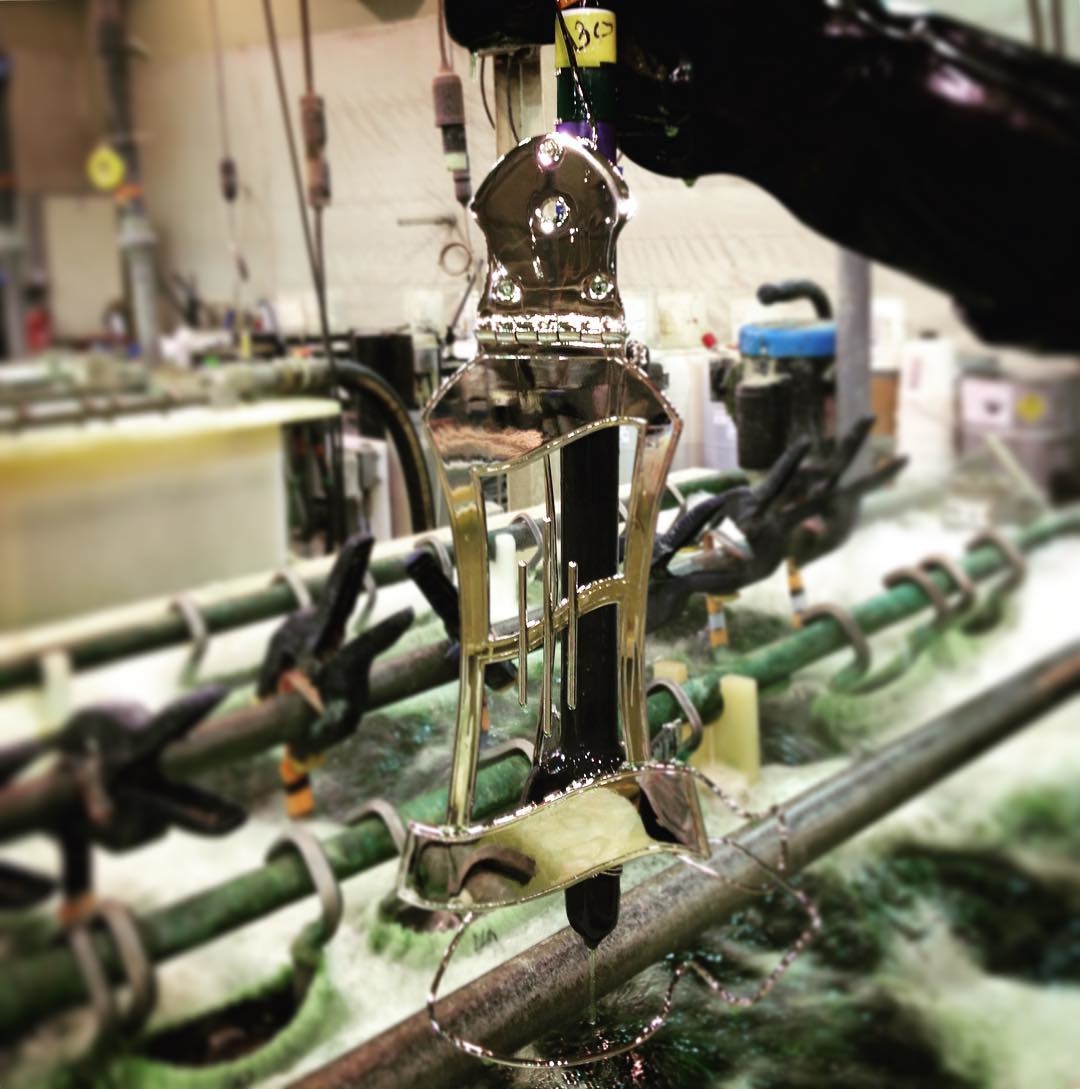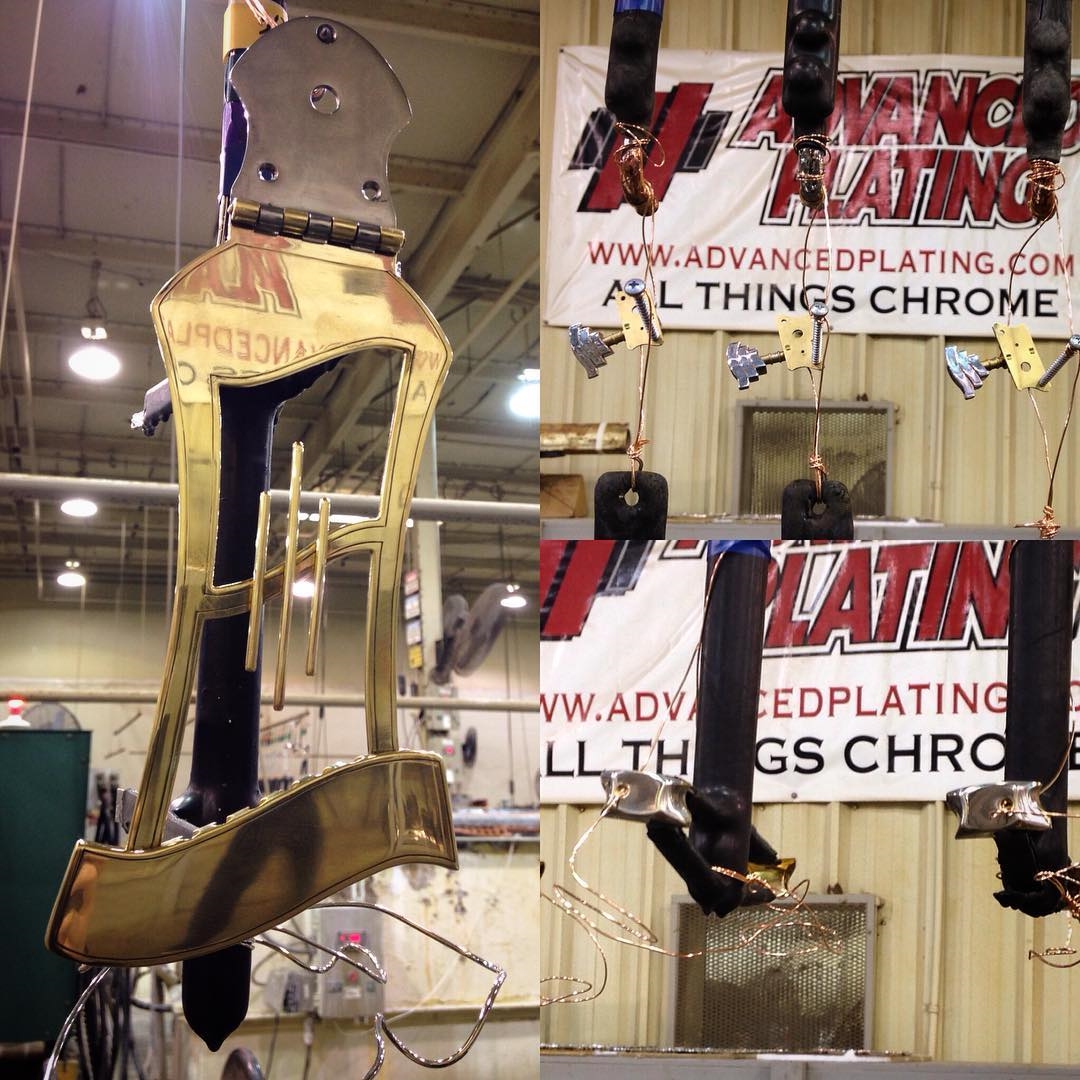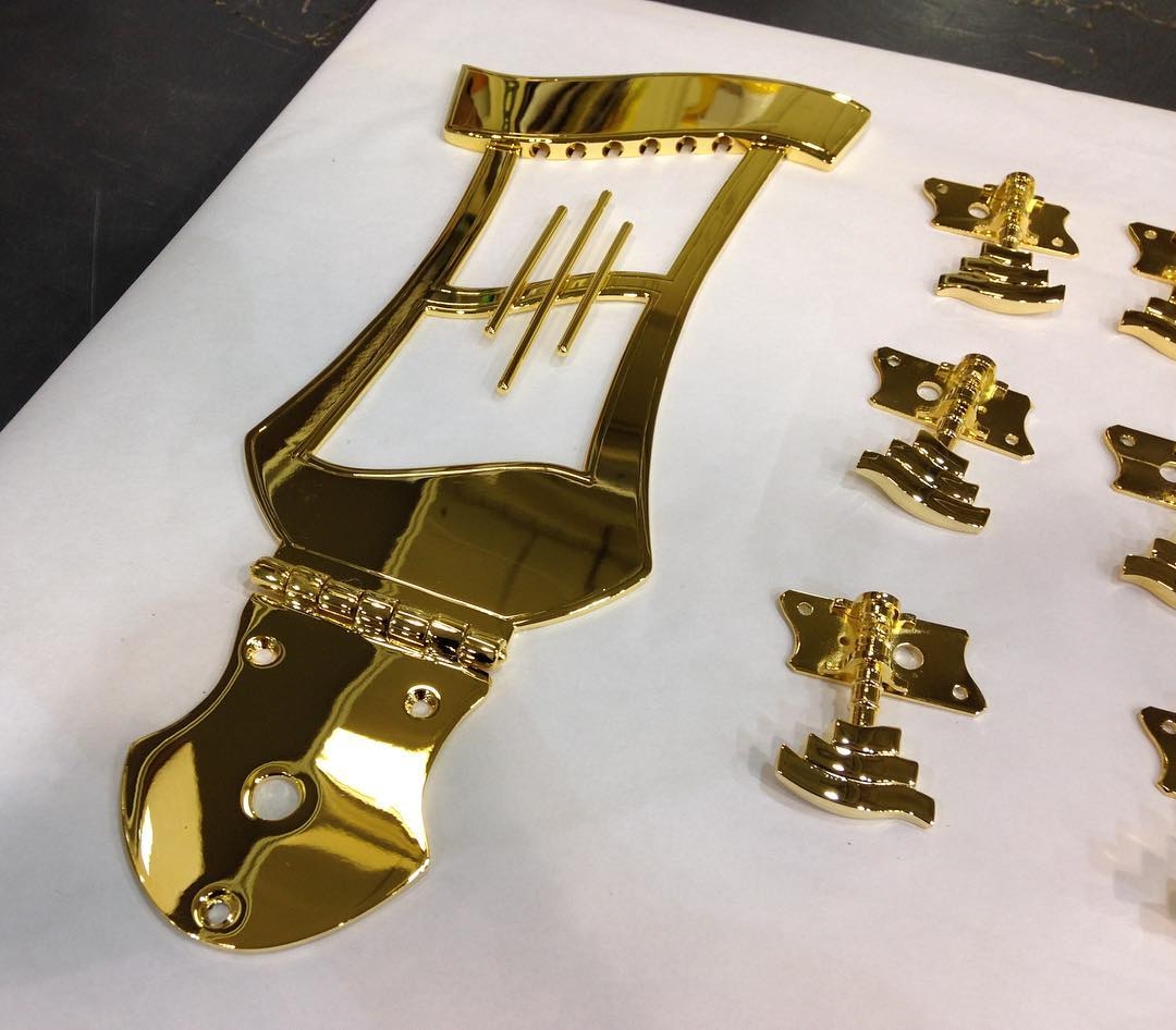 Because our parent company (Advanced Plating) is a chrome plating facility, we also offer full plating and restoration services for many companies in the music industry. We recently received these vintage Hagstrom pieces from a customer for full restoration. We first start by stripping off any old plating and grime, returning them to their natural state. Then we fill in any imperfections and polish the parts to get them ready for re-plating which in this case is 24K Gold.